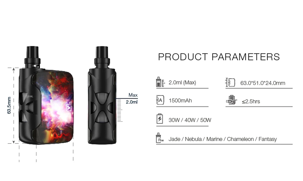 Выходная мощность: 30 Вт, 40 Вт, 50 Вт Емкость бака: 2,0 мл Сопротивление: спираль Kanthal coil 0,25 ом Емкость аккумулятора: 1500 мАч Размер модели: 63.5x54x24мм
