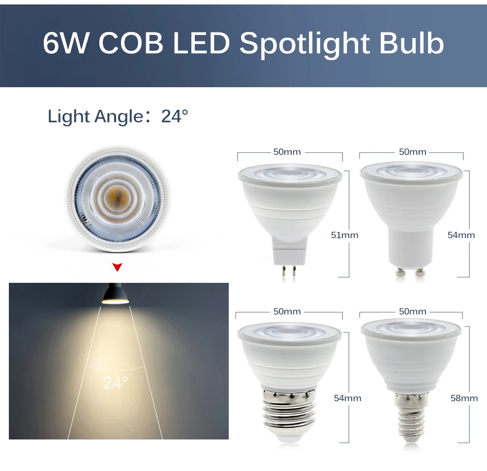 Описание продукта: • Мощность: 6 Вт Световой поток Напряжение: AC220-240V Разъем: MR16/GU10/E27/E14 Цветовая температура: холодный белый 6000-6500 К, теплый белый 2700-3000 К Угол луча: 24/120 градусов Срок службы: более 30000 часов Материал: ПК + алюминий