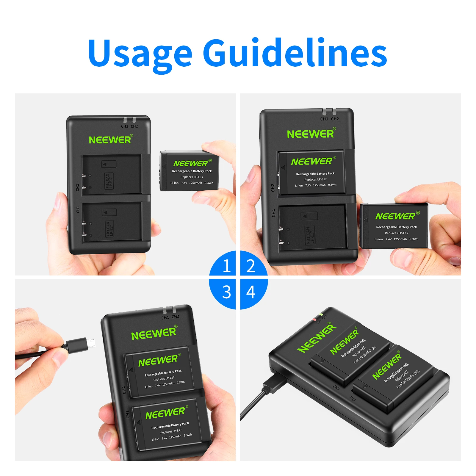 Neewer аккумуляторная батарея и зарядное устройство в комплекте 2 упаковки 7,4 V 1250mAh LP-E17 сменные батареи и двойное зарядное устройство USB, давая вам полное решение резервного копирования, чтобы предложить достаточно мощности, не нужно беспокоиться о сбое питания, когда вы хотите записать замечательный момент.