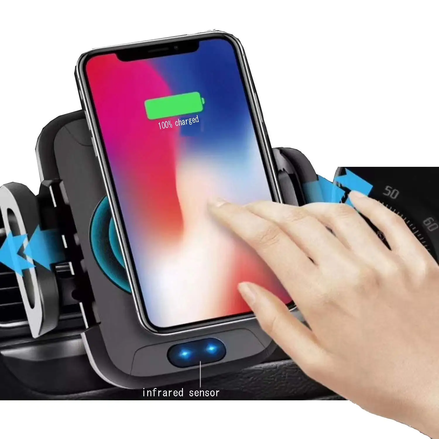 Это легкий Автомобильный держатель для мобильного телефона одной рукой. Автоматически растягивается держатель с помощью инфракрасного зондирования, когда сотовый телефон приближается, а затем автоматически зажимается. Одно легкое прикосновение, чтобы вынуть сотовый телефон.