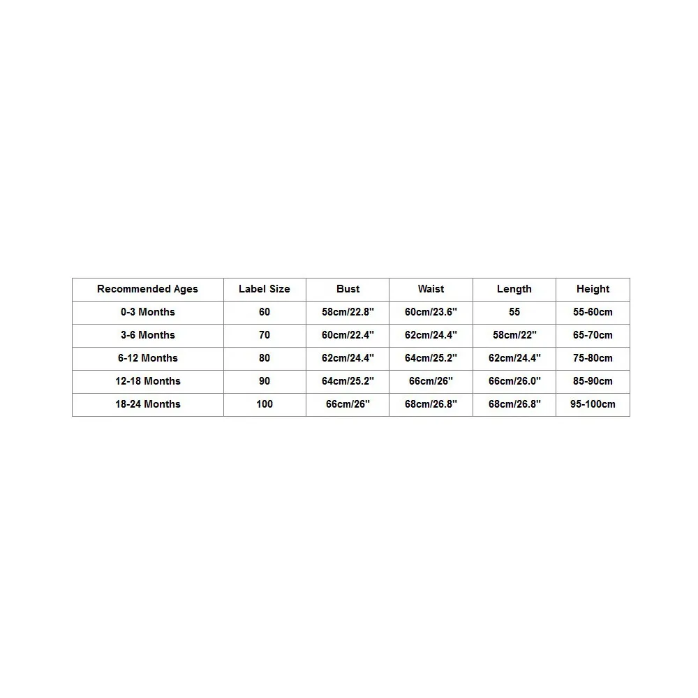 Рекомендуемый возраст Этикетка Размеры Обхват груди Обхват талии Длина Высота 0-3 месяца 60 58 см/22,8" 60 см/23,6" 55 55-60 см С диагональю экрана 3-6 месяцев 70 60 см/22,4" 62 см/24,4" 58 см/22" 65-70 см 6-12 месяцев 80 62 см/24,4" Высота голенища 64 см/25,2" 62 см/24,4" 75-80 см 12-18 месяцев 90 Высота голенища 64 см/25,2" 66 см/26" 66 см/26,0" 85-90 см 18-24 месяцев 100 66 см/26" 68 см/26,8" 68 см/26,8" Для детей ростом 95-100 см