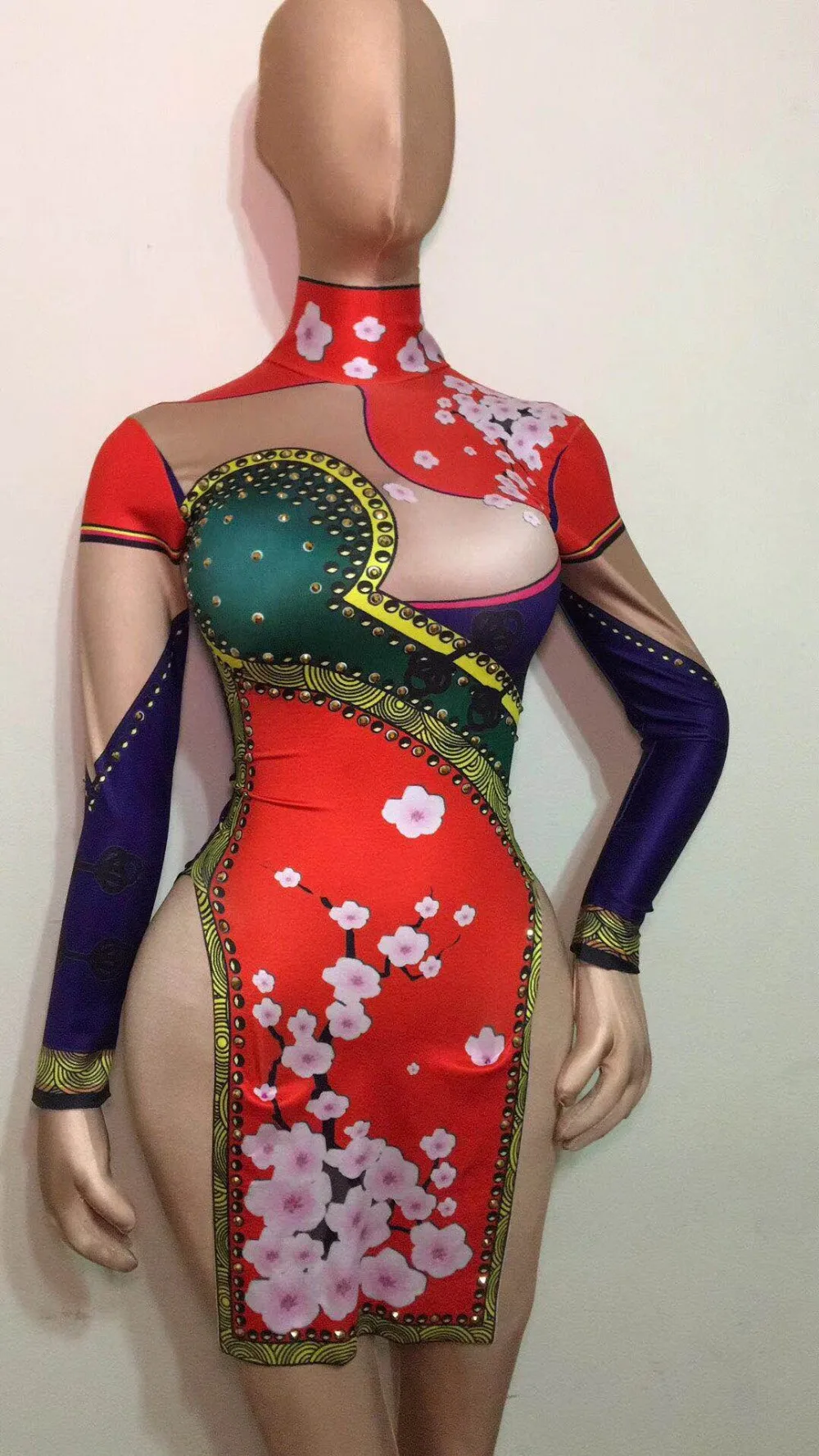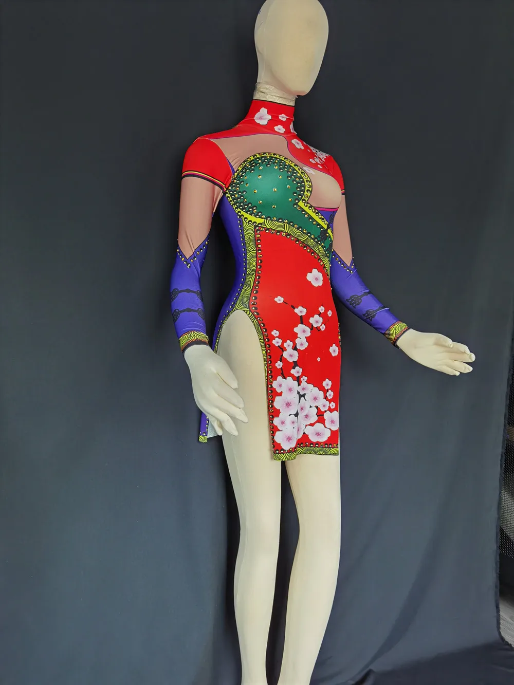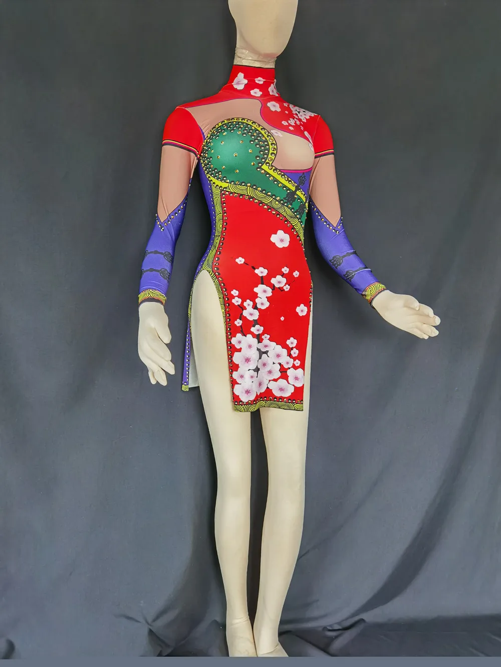 Женское платье-Чонсам с цветочным принтом Christia Bella, сексуальное облегающее платье телесного цвета, Клубное платье для сцены, костюмы с высоким разрезом для выступлений