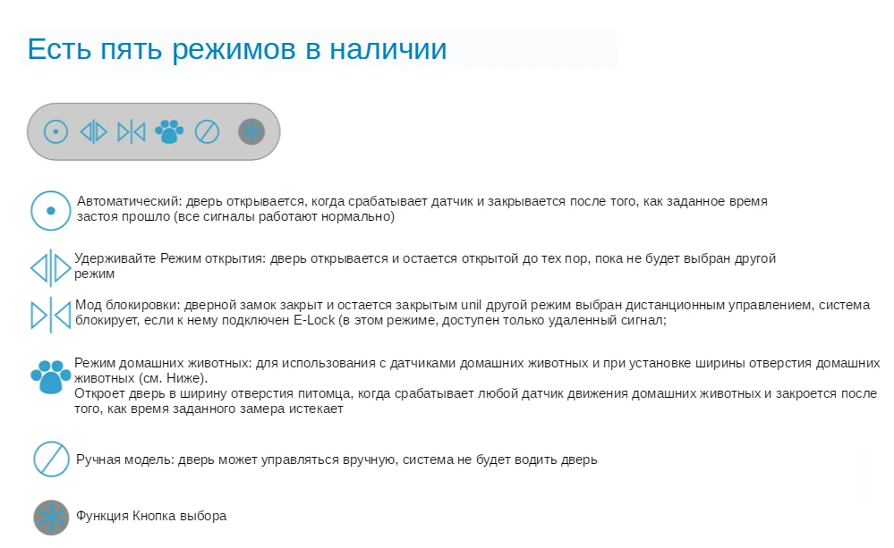 1. Легко устанавливается, без изменения структуры двери. 2. Компактный размер, приятный внешний вид и современный дизайн. 3. Система может применяться с датчиком, пультом дистанционного управления, кнопкой, переключателем для домашних животных, фотоэлементом, кардридером, замком и т. д. 4. Режим окон и дверей может быть выбран произвольно. 5. Модуль 433,92 Гц, подходит для умного дома.