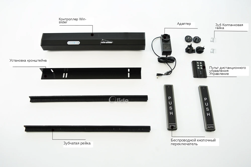 Один комплект электрический Открыватель дверей включает в себя: автоматический слайдер, адаптер, кронштейн для установки, пульт дистанционного управления, гайку для зубчатой крышки, одну пару беспроводных кнопочных кнопок и шестеренок.