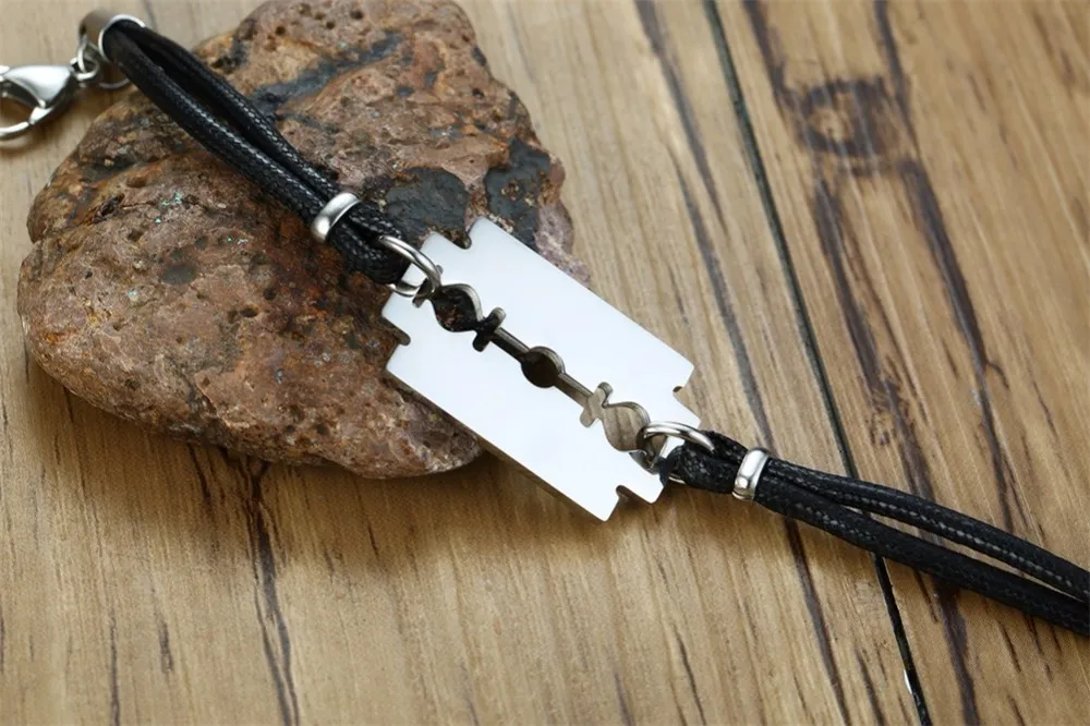 Аутентичные silverly нержавеющая сталь лезвия бритвы черный кожаный браслет. Сейчас у вас есть дополнением к вашему бритвенное лезвие коллекции. Ссылка застежка с безопасности защелки. Нержавеющая сталь, создавая современный городской края.