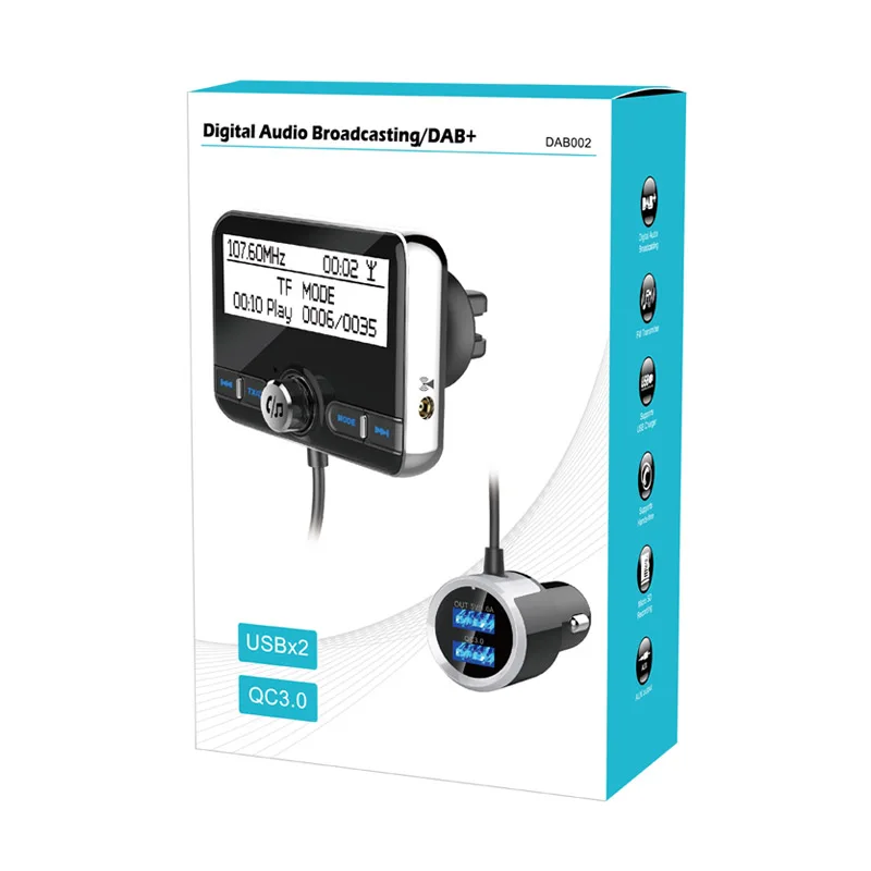 Этот автомобильный комплект является автомобильным цифровым аудио вещанием, принимает Профессиональный высокопроизводительный цифровой вещательный процессор; Встроенный кодирование, модуляция и передача DAB сигнала к автомобильной аудиосистеме; это многофункциональное устройство, которое может заряжать ваш мобильный телефон, приносит клиенту лучший Интеллектуальный опыт!