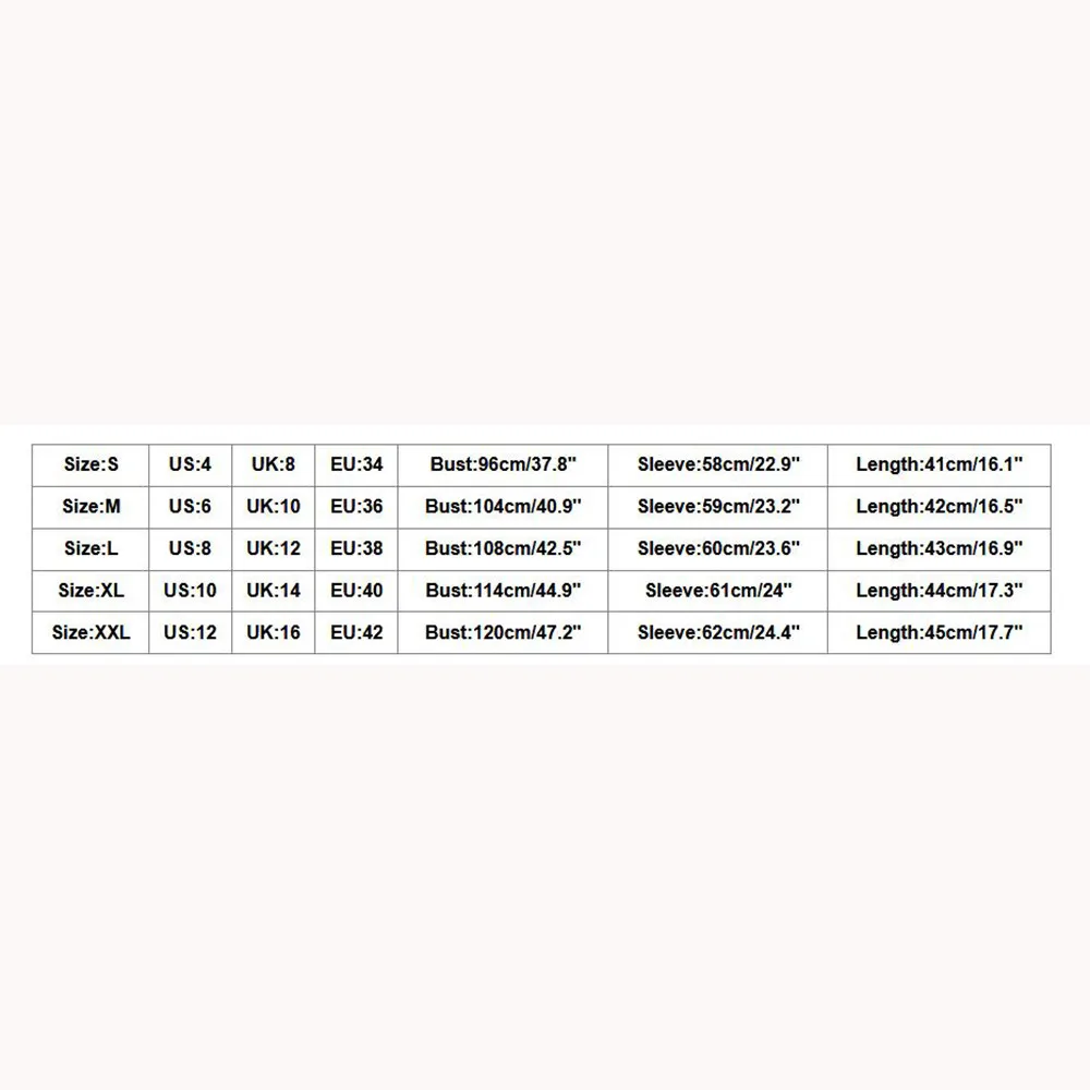 Размер: S Обхват груди: 96 см/37,8 "Длина рукава: 58 см/22,8" Длина: 41 см/16,1" Размер: M Обхват груди: 104 см/40,9 "Длина рукава: 59 см/23,2" Длина: 42 см/16,5" Размер: L Обхват груди: 108 см/42,5 "Длина рукава: 60 см/23,6" длина: 43 см/16,9" Размер: XL Обхват груди: 114 см/44,9 "Длина рукава: 61 см/24,0" Длина: 44 см/17,3" Размер: 2XL Бюст: 120 см/47,2 "рукав: 62 см/24,4" Длина: 45 см/17,7"