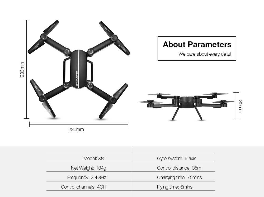 Дроны выполняют множество целей, включая высококачественные фото и видео; но они также могут позволять людям просто веселиться. Вот почему X8T входит. Он сам по себе является простым в использовании и доступным для начинающих. Он имеет множество удивительных особенностей, главным образом, в том числе встроенный 6-осевой gyro стабилизационная система, которая дает вам более плавными и безопасными полета. Пульт дистанционного управления 2,4 ГГц, удержание высоты, Безголовый режим, управление одним ключом, все это даст вам лучшую производительность в своем ценовом диапазоне.