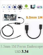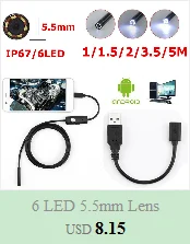 Особенности: 100% новый и высокое качество! Фотосъемка и запись видео. Он может снимать изображения и видео. Водонепроницаемый проводной эндоскоп, прочный для использования. Гибкий кабель USB идеально подходит для подключения к телефону android или компьютерам. Подходит для использования в геодезических трубах, оборудовании, установке мебели, подводном просмотре и т. д. Характеристики: Диаметр линзы: 5,5 мм Разрешение 640*480 Размер датчика: 1/9 дюйма Частота кадров: 30 кадров в секунду Угол обзора: 67 градусов Класс водонепроницаемости: IP67 Рабочая температура: от 0 до 70 градусов От USB power 5 V DC Поддержка компьютера: для W8, для W7 Поддержка VISTA XP Формат изображения: JPEG Формат видео: AVI Длина: 1 м, 2 м, 5 м, 10 м Цвет: черный, красный, желтый Комплектация: 1 x эндоскоп для телефона