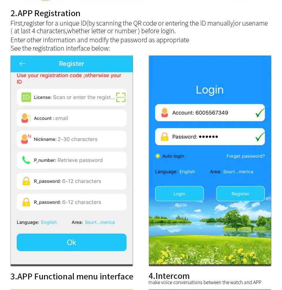 1. Сканируйте qr-код на упаковочной коробке или непосредственно загрузите приложение из app store вашего телефона. 2. Загрузите приложение «Setracker» и зарегистрируйте учетную запись. 3. сканируйте или Введите идентификатор устройства. каждое устройство имеет только один уникальный идентификатор, его можно использовать только один раз, и это доступ для подключения часов и телефона. (Если во время входа ID был зарегистрирован, пожалуйста, свяжитесь с нами для сброса.) 4. Выберите язык и расположение сервера. После того, как вы сканируете идентификатор устройства и заполните имя и пароль учетной записи. Вы должны выбрать язык и сервер в вашей области, прежде чем закончить его. (здесь, пожалуйста, убедитесь, что выбрали правильное местоположение сервера, или привести к «устройству в автономном режиме» во время позиции.) 5. Другие советы следует обратить больше внимания: * Вам нужно иметь правильную sim-карту, также Откройте функцию потока данных 2G для интернета и функции вызова. (Примечание: Не все sim-карты подходят для этих часов.)