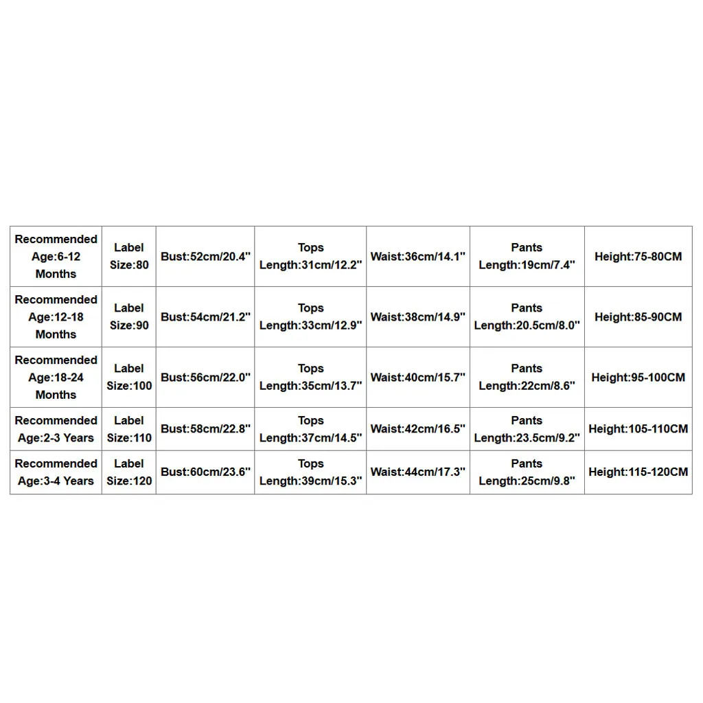 Рекомендуемый возрастРазмер этикеткиБюстДлина топаТалияДлина брюкВысота6-12 месяцев8052 см/20,4"31 см/12,2 дюйма36 см/14,1"19 см/7,4 дюйма75-80 см12-18 месяцев9054 см/21,2"33 см/12,9 дюйма38 см/14,9"20,5 см/8,0 дюйма85-90 см18-24 месяцев10056 см/22,0"35 см/13,7"40 см/15,7"22 см/8,6"95-100 смОт 2 до 3 лет11058 см/22,8"37 см/14,5"42 см/16,5"23,5 см/9,2 дюйма105-110 смОт 3 до 4 лет12060 см/23,6"39 см/15,3"44 см/17,3 дюйма25 см/9,8 дюйма115-120 см
