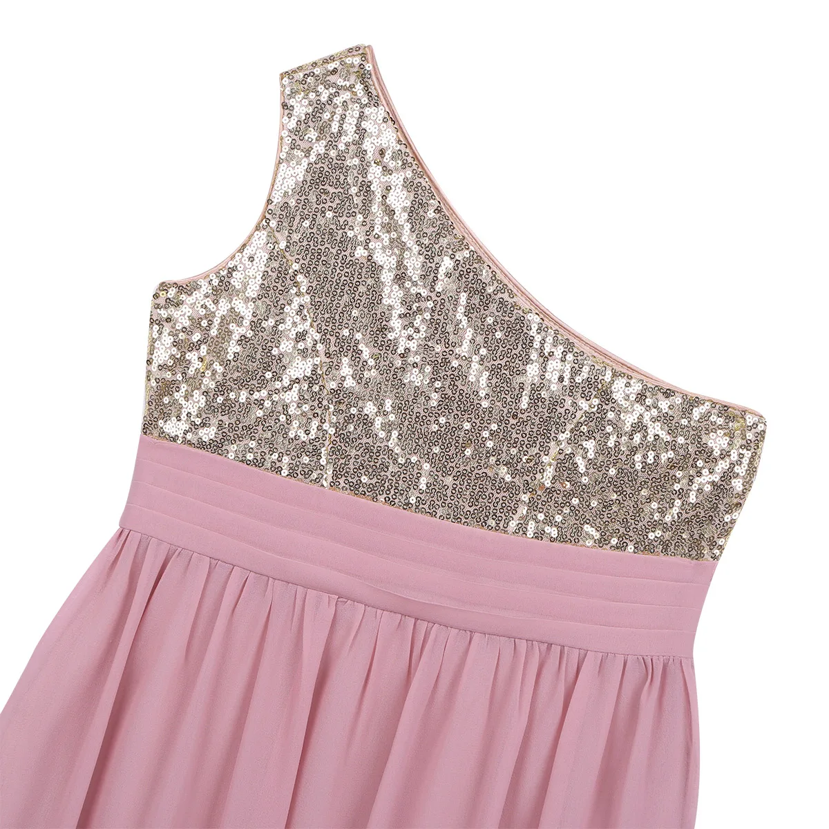 Дизайн на одно плечо, верхний Лиф украшен блестками. Плиссированный стиль с высокой талией. Полная подкладка.