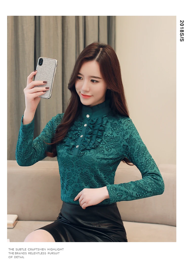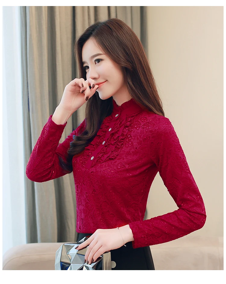 Осенне-зимние женские блузки, повседневные рубашки с длинным рукавом и цветочным кружевом, элегантные тонкие бархатные теплые плотные топы размера плюс