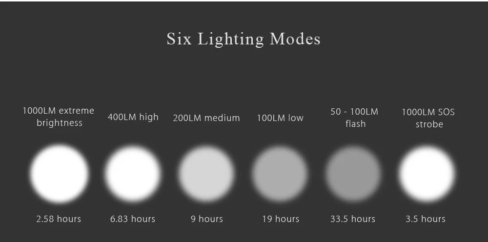 -После включения питания, кратковременно нажмите кнопку переключателя для того, чтобы изменить светильник режима с последующим 1000LM экстремальных яркости-400LM с высоким уровнем 200LM средне-100LM с низким уровнем в переменного тока, 50-100LM флэш-1000LM SOS стробоскопа