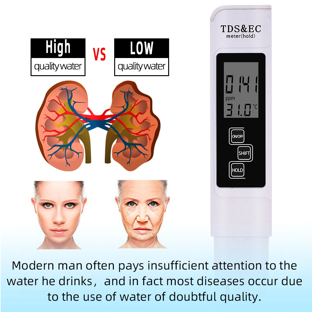 Обеспечивает точные и надежные показания теста:3-в-1 цифровой измерительный прибор TDS обеспечивает точные показания для TDS (всего растворенные твердые вещества) EC (электропроводность) и температуры. Профессиональный, точный и точный 3-в-1 TDS, EC, и Температура воды метр. Измеритель TDS имеет автоматическую компенсацию температуры в режиме измерения. 9 минут без работы, счетчик автоматически отключится. Экономия энергии, увеличение срока службы батареи