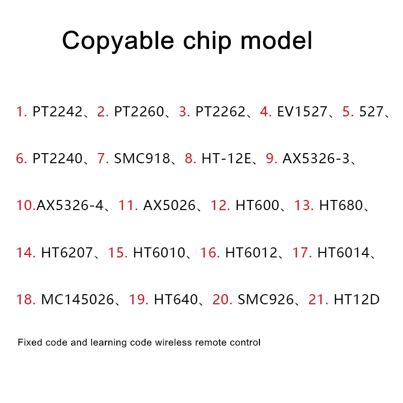 Метод очистки кода:Нажмите и удерживайте две кнопки блокировки и Разблокируйте одновременно, когда светодиодный индикатор мигнет 3 раза, затем отпустите правую руку (не отпустите левую руку), И нажмите правую кнопку три раза подряд правой рукой, И смотрите индикатор, который он продолжает мигать, и функция clear завершена, что означает, что все данные ключевого хранилища очищены. После очистки кода можно использовать следующие операции для восстановления последних использованных данных перед копированием новых данных. При одновременном нажатии двух кнопок на пульте управления подождите три секунды, чтобы убедиться, что светодиодный индикатор мигает непрерывно и функция восстановления данных завершена, это означает, что все кнопки восстанавливаются для хранения данных. Дубликат:После того, как код будет очищен, поставьте скопируемый пульт дистанционного управления, а пульт дистанционного управления закрывается на одном рабочем столе, нажмите и удерживайте кнопку для копирования и кнопку дистанционного управления одновременно, И посмотрите, что светильник катор мигает пять раз после этого, и затем светильник Это доказывает, что копия выполнена успешно. Меры предосторожности 1. При копировании расстояние между пультом дистанционного управления копированием и скопированным пультом дистанционного управления не может быть очень далеко. Большое расстояние приведет к неполному копированию данных и большой ошибке сопротивления колебаний копий. При копировании пульт дистанционного управления копированием должен быть как можно ближе к скопированному пульту дистанционного управления. Несмотря на то, что этот пульт дистанционного управления копированием обеспечивает высокую прочность поля, это позволяет значительно уменьшить ошибку копирования данных и ошибку сопротивления колебаний и повысить точность копирования. 2. Не размещайте пульт дистанционного управления на металлической поверхности для копирования, так как это уменьшит расстояние копирования и точность параметров копирования. 3. Старайтесь не копировать при низком заряде батареи, что в определенной степени повлияет на точность копии. 4. Старайтесь не держать его в руке при копировании, и его следует поставить на стол для закрытых операций. 5. Не открывайте пульт дистанционного управления по желанию и не храните и не используйте пульт дистанционного управления в условиях высокой температуры, высокого давления и высокой влажности. 6. При замене аккумулятора правильно Установите полярность аккумулятора. Посылка входит 1x пульт дистанционного управления (с батареей)Взяла по акции, несколько футболок на все лето по очень адекватной цене. Цвет немного отличается от картинки на сайте, но... Читать отзыв полностью...
