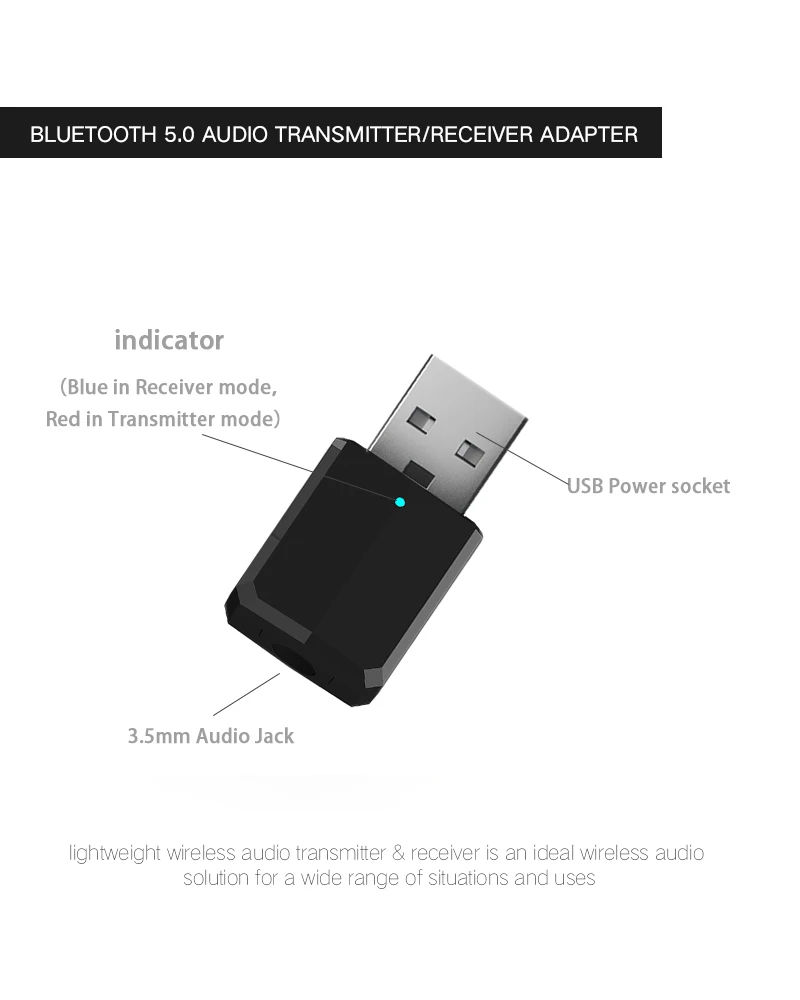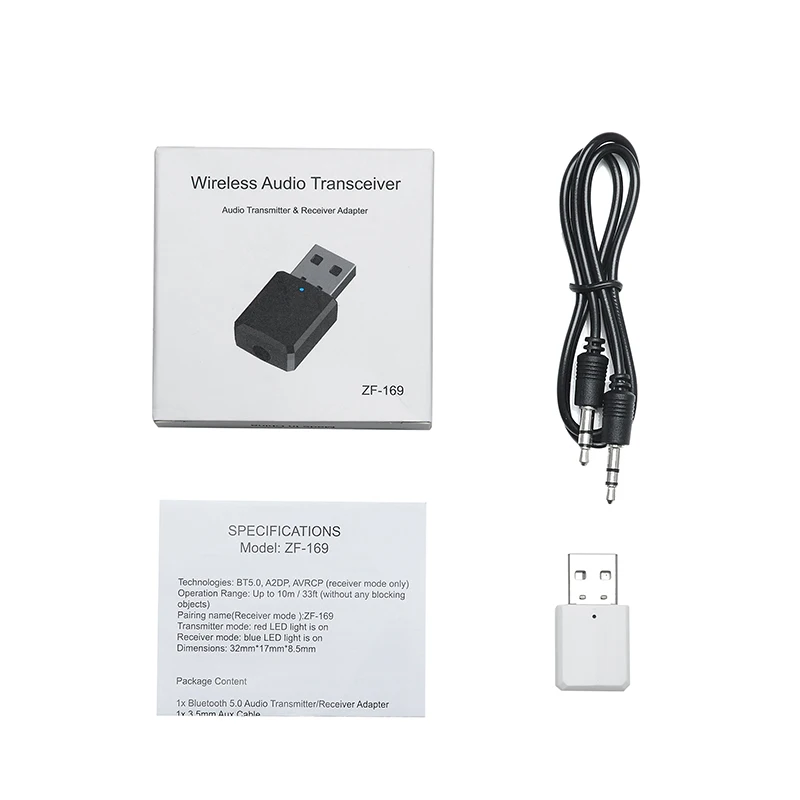 Технические характеристики Модель: ZF169 Технологии: BT5.0, A2DP, AVRCP (только режим приемника) Рабочий диапазон: до 10 м/33 фута (без каких-либо блокирующих предметов) Имя сопряжения (режим приемника):ZF169 Режим передатчика: Красный светодиодный светильник включен Режим приемника: синий светодиодный светильник включен Размеры: 32 мм * 17 мм * 8,5 мм Посылка Содержание 1x Bluetooth 5,0 аудио передатчик/приемник адаптер 1x3,5 мм Aux кабель 1x Руководство пользователя