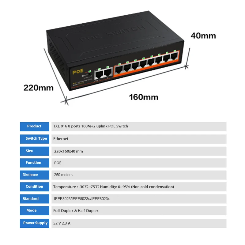 Товар: TXE016 8-портовый + 2 канала связи 100 Мбит/с Стандартный коммутатор питания через ethernet Переключатель Тип: Ethernet Размер: 220x160x40 мм Расстояние передачи: 250 м Стандарт: IEEE 802,3/IEEE802.3u/IEEE 802.3x Функция: POE Состояние: температура: -30 ℃ ~ 75 ℃ Влажность: 0 ~ 95% (не холодная конденсация) Режим связи: полный дуплекс и полудуплекс Питание: 52 V 2,3 A 120W