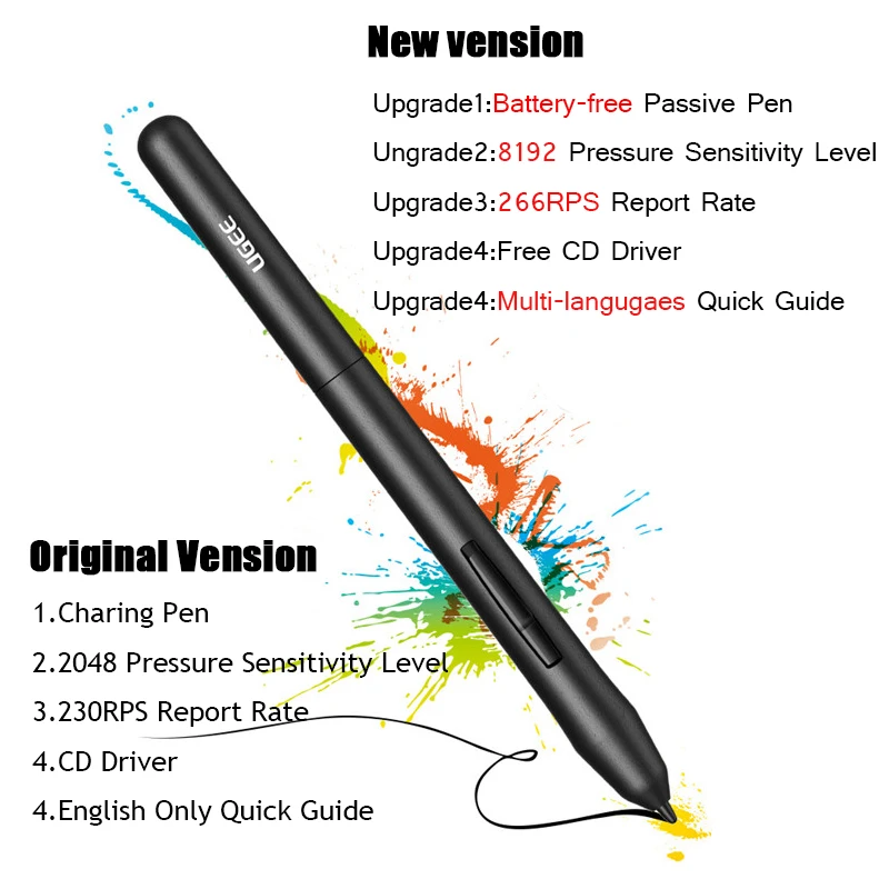 Основные характеристики и диффузность со старым Ugee M708: 1. Ручка аккумулятора заменяется на ручку без батареи, более удобна и практична. 2,2048 уровней давления изменяются до 8192 уровней давления, более чувствительные, умелые рукописные работы. 3. Максимальная скорость отчета 230 меняется на максимум 266. 4. У вас нет драйвера CD, вы можете скачать непосредственно на веб-сайте Ugee offical. (Http://www.ugee.net/download/index/id/65.html). 5.Mult-language Quick Guide (английский, китайский, японский, русский, голландский, французский, корейский, итальянский, португальский, испанский) вы также можете скачать руководство пользователя на официальном веб-сайте сначала просмотреть его (http://www.ugee.net/download/index/id/65.html). 6. Параметры задней части коробки немного изменились. 7. Улучшенная версия M708 V2 Android совместима с системами Android 6,0 и выше.