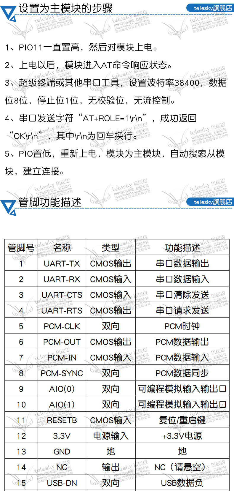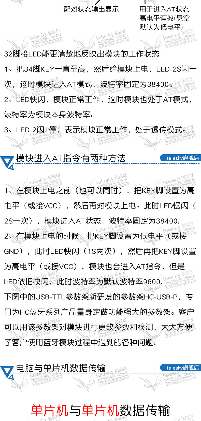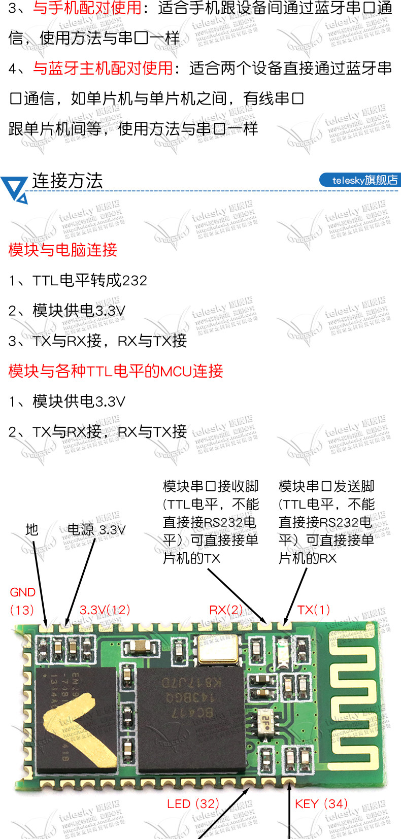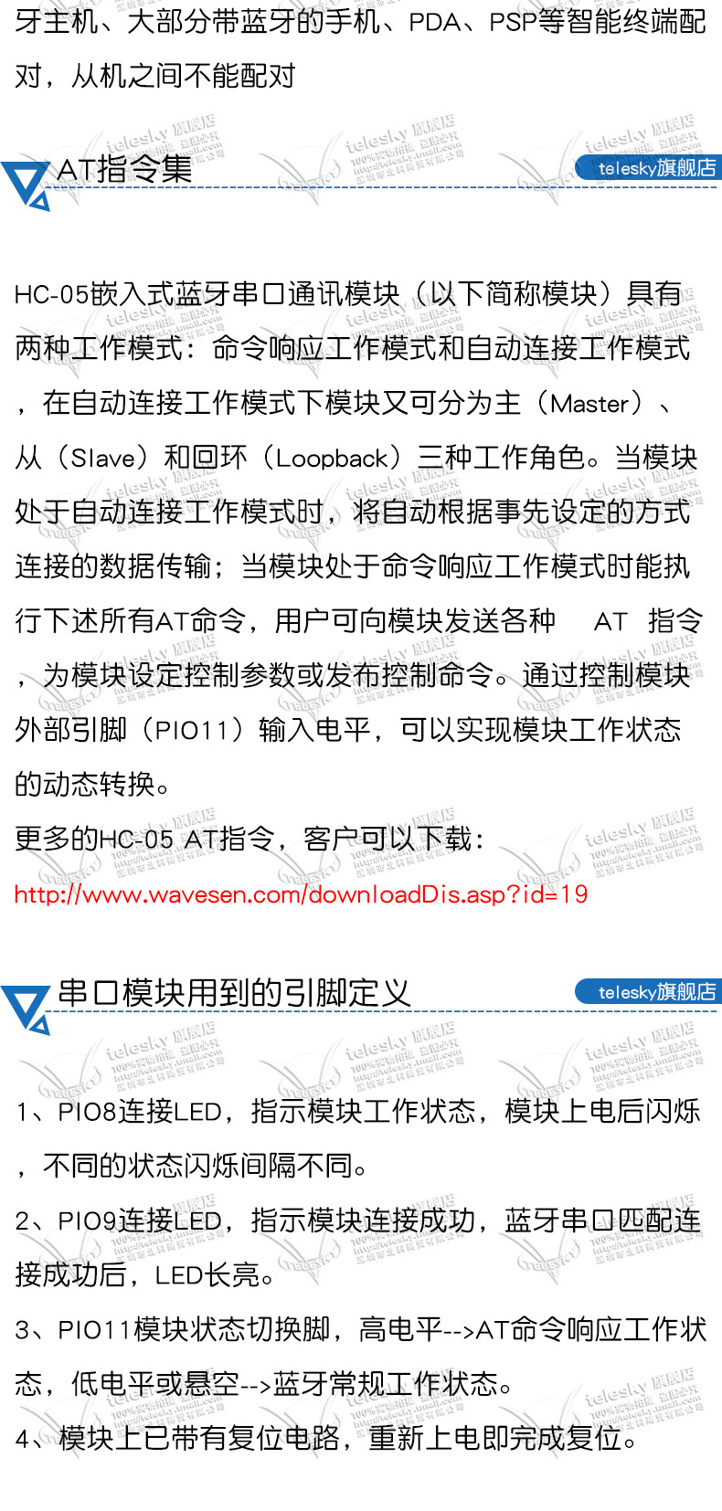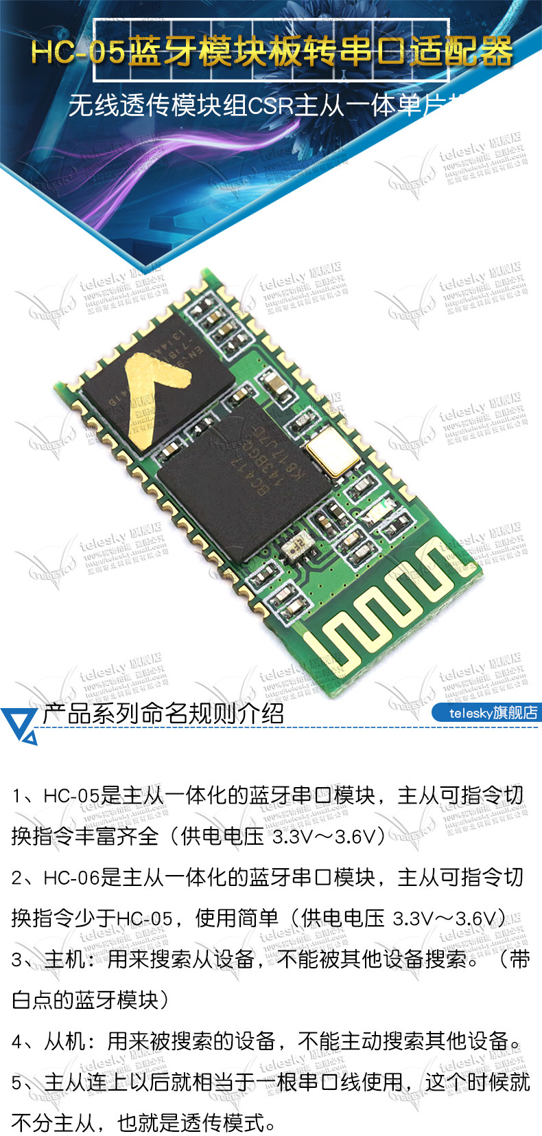 Введение в Правила именования семьи продуктов 1. HC-05-это интегрированный модуль Bluetooth master-slave с последовательным подключением, который можно управлять и резать.Инструкция богатая и полная (напряжение питания 33y ~ 3,6 V)2. HC-06 является встроенным модулем последовательного порта Bluetooth master-slave.Команда меньше, чем HC-05, и использование простое (напряжение питания 3,3 В ~ 36 В)3. Хост: используется для поиска подчиненных устройств и не может быть произведен поиск другими устройствами. (полосаМодуль Bluetooth с белой точкой)4. Slave: устройство, используемое для поиска, не может активно искать другие устройства.5, после того как мастер и раб подключены, это эквивалентно веревке с переплетенными линиями, на этот разНезависимо от мастера и работника, то есть прозрачный режим.6, [этот модуль может быть установлен как мастер или раб, хост может быть сопряжен с рабомПисьмо, раб и раб не могут общаться между хостом и хостом, рабомМожет общаться с Bluetooth, таким как мобильный телефон компьютера, по умолчанию является рабом при покупке]7, [Примечание: HC-05 хост может быть сопряжен с 06 рабами] Описание товара Принять csR основной чип Bluetooth, Bluetooth & or; стандарт протокола 2,0.2. Напряжение питания модуля: 3,3 В ~ 3,6 В.3, параметры по умолчанию: скорость передачи данных 9600, код сопряжения 1234, режим работыРаб.4. Размер основного модуля: 27 мм × 13 мм x 2 мм., Рабочий ток: Сопряжение: 30 ~ 40 мА сопряжение не сообщено2 ~ 8 мА связь: 8 мА не спит.6, расстояние связи: 10 м при открытых условиях, нормальное использование 8 м слеваСправа7, для GPS навигационной системы, воды и электричества счетчика газа считывания системы, промышленный сайтСистема управления приобретением, может быть подключена к Bluetooth ноутбуку, компьютеру плюс Bluetooth адаптеруУстройства, такие как КПК, легко подключаются.8, может быть беспроводное обновление и загрузка программы для микроконтроллера sTC. Применение Этот модуль в основном используется в области беспроводной передачи данных на короткие расстояния. УдобныйПодключен к Bluetooth устройству ПК, или данные между двумя модулямиСовместимость. Избегайте громоздких кабельных соединений и непосредственно заменяйте шнурок.1. Bluetooth-гарнитура для автомобиля2, Bluetooth GPS3, Bluetooth PCMC | A, USB ключ4. Беспроводная передача данных по Bluetooth;5. Промышленный пульт дистанционного управления и Телеметрия;6, pos-система, беспроводная клавиатура, мышь;7. Расположение и сигнализация дорожного движения под землей;8. Автоматизированная система сбора данных;9. Беспроводная передача данных; банковская система;10. Беспроводной сбор данных;11, автоматизация зданий, безопасность, компьютерное оборудование, беспроводной мониторинг, система контроля доступа12. Умный дом и промышленный контроль;3. Автомобильное испытательное оборудование;14. Интерактивная программа голосового оборудования телевизионной станции;15. Правительственная уличная лампа энергосберегающее оборудование16, беспроводная система светодиодного дисплея17, Bluetooth джойстик, Bluetooth геймпад18, Bluetooth принтер9, Bluetooth пульт дистанционного управления игрушка Использование продукта 1. После сопряжения, вам нужно только использовать его в качестве последовательного порта с фиксированной скоростью передачи данных.До тех пор, пока это "фиксированная скорость передачи данных, 8-битные бит данных, нет четности"Серийные устройства в формате связи могут непосредственно 