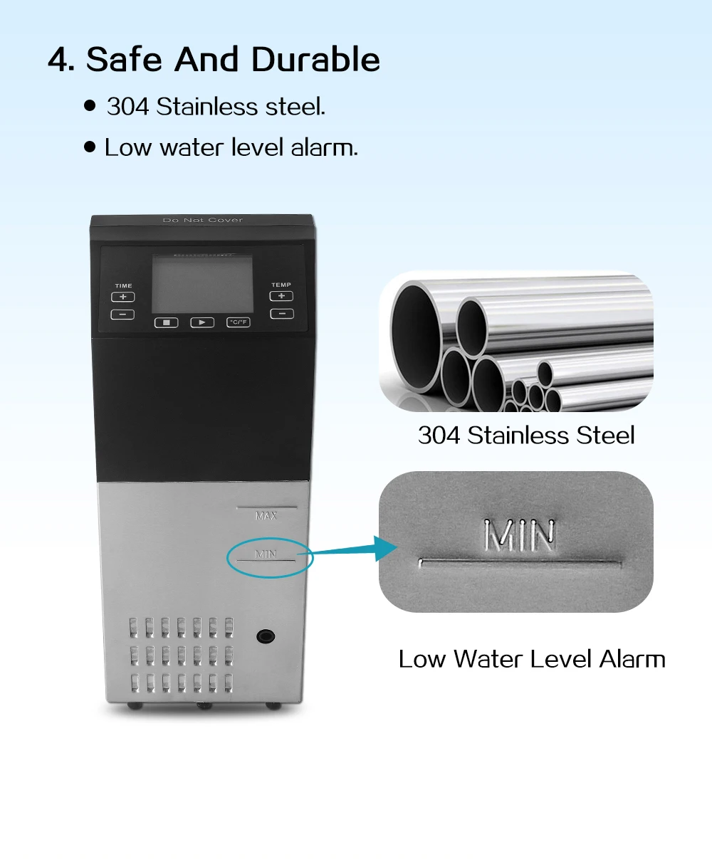 -Обеспечивает точный и последовательный контроль температуры для равномерного приготовления пищи -Нагревается до 30 л (8 галлонов) воды -Подходит для дома, ресторана, отеля и т. д. для компактной кухни -Простая цифровая панель управления -Автоматическое приготовление пищи с настройкой времени и температуры -Насос с двигателем AD 12 V -Простота в использовании и применение ко всем видам продуктов -Конструкция из нержавеющей стали -Тихая работа -Легкие портативные зажимы для циркулятора погружения, применяемые к любому горшку или резервуару с круглыми или плоскими стенками 6 или более глубокими. -Сигнализация низкого уровня воды -220-240 В, 1500 Вт, включая шнур и вилку. -Для ресторанов, гостиниц, баров, небольших пекарен