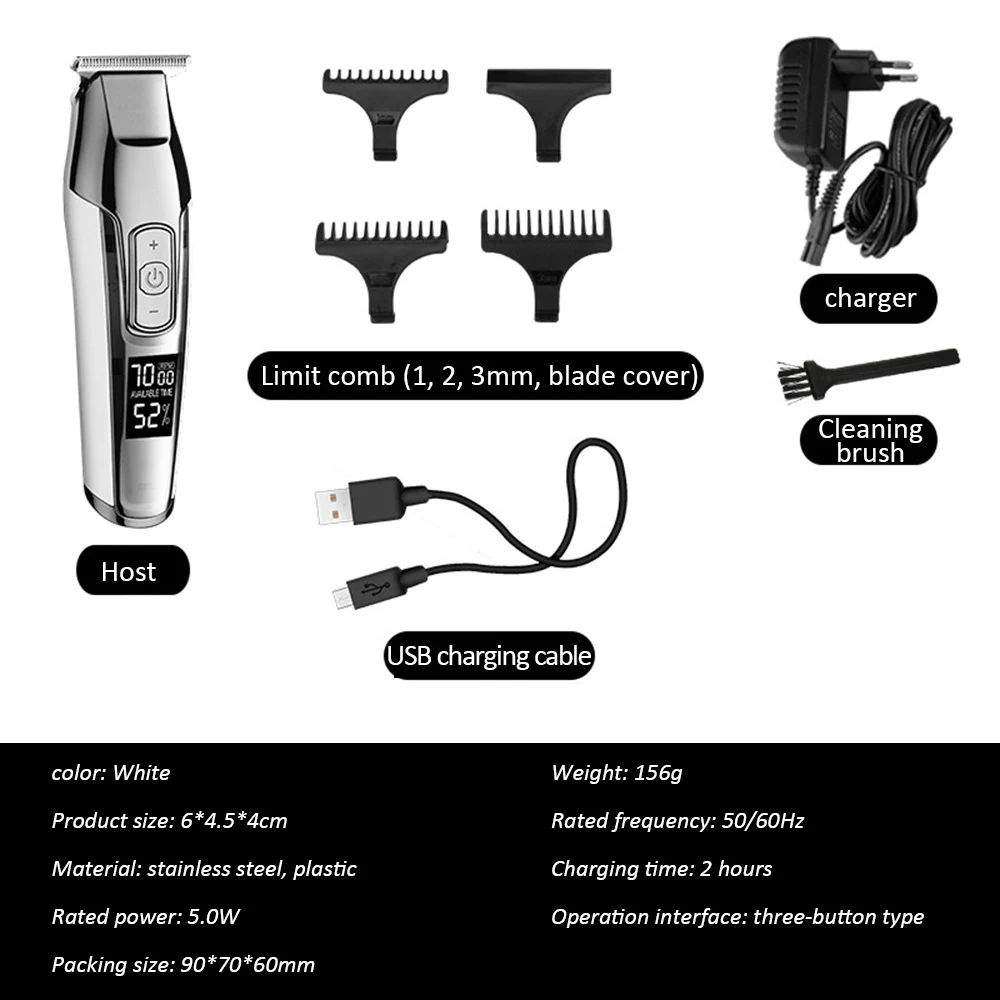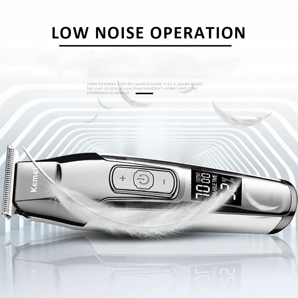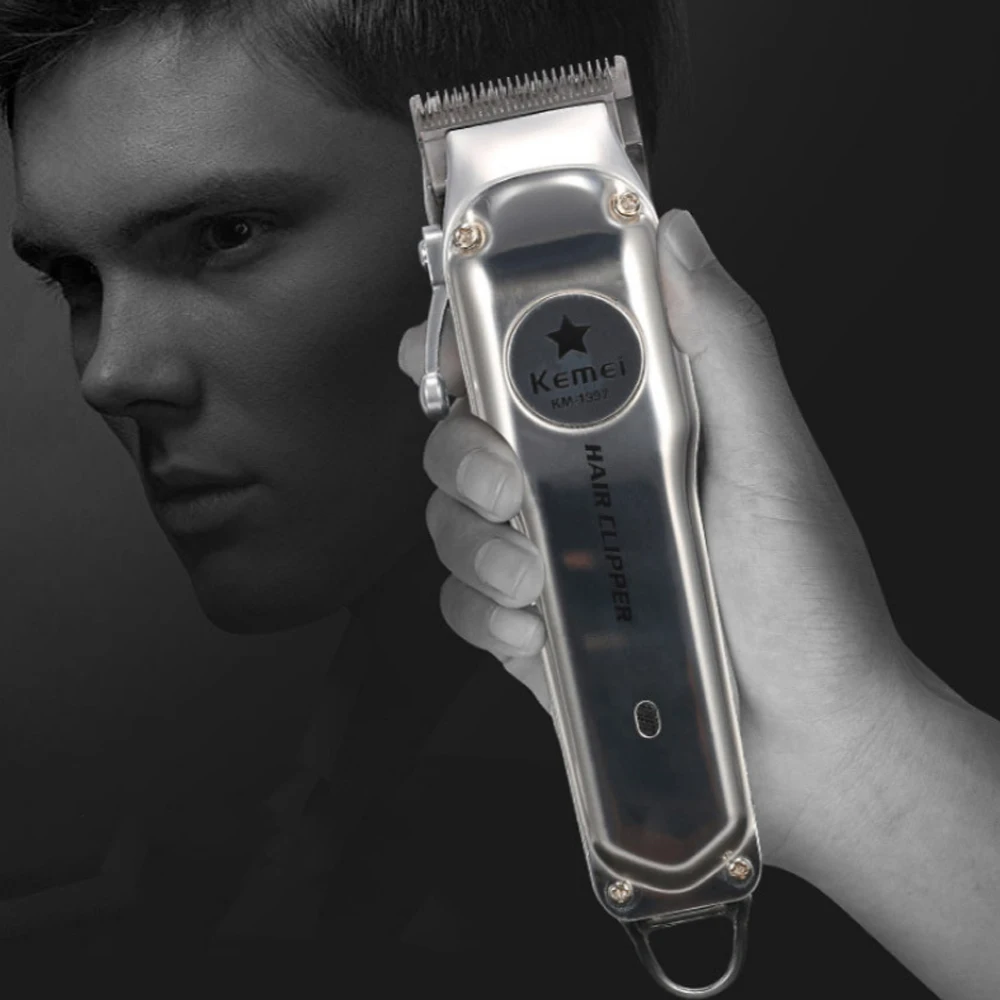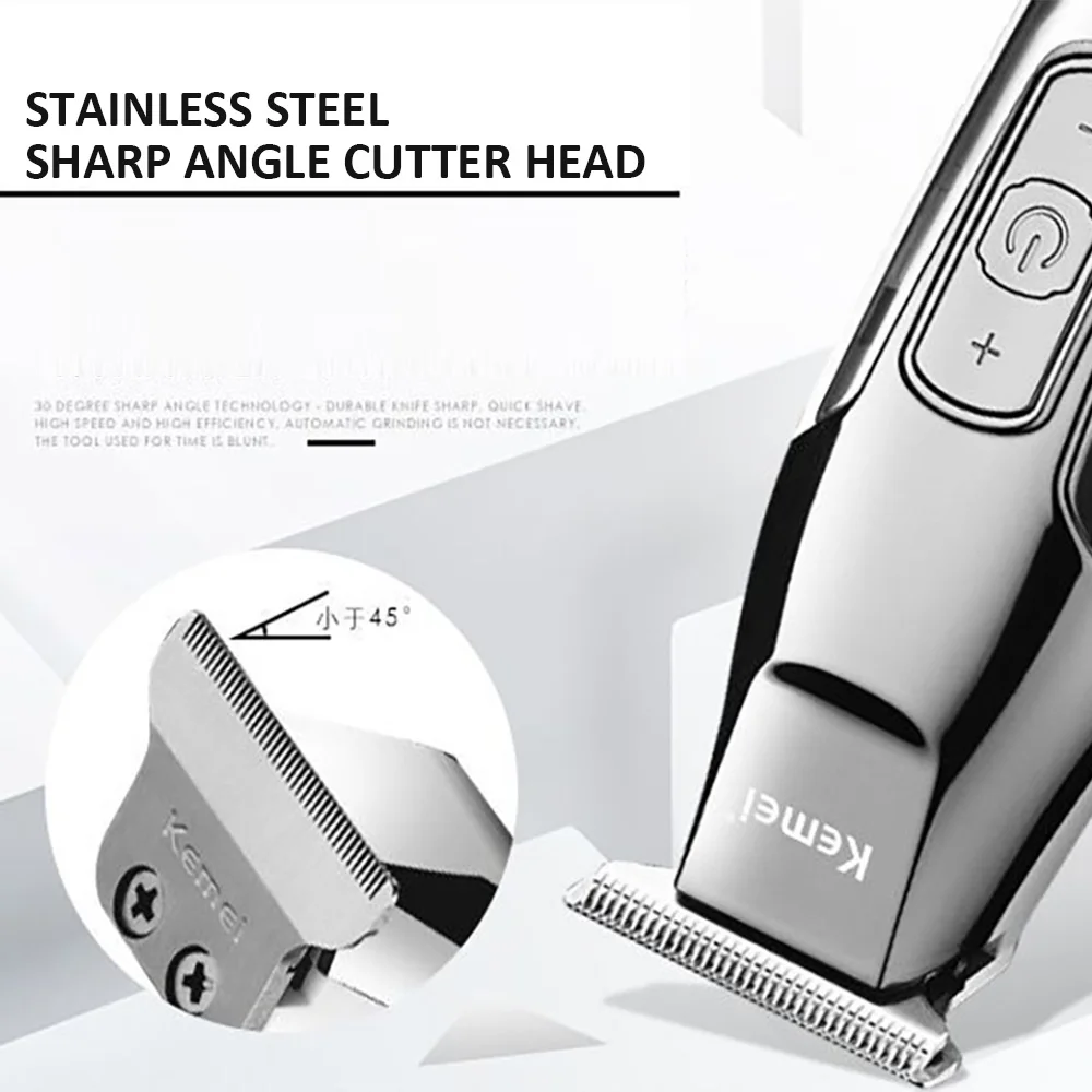 Имя: Профессиональная электрическая машинка для стрижки волос Kemei Модель: КМ-1996 Цвет: серебристый Головка ножа: ножевая головка из нержавеющей стали Размер тела: 17. 5 см * 4 см Вес тела: 438 г Размер упаковки: 22 см * 18,5 см * 6 см Материал корпуса: Гальванический корпус Номинальное напряжение: 110-240 В Способ зарядки: подключи и играй