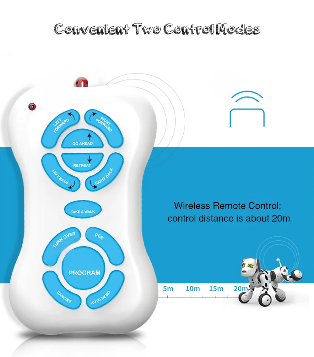 Интеллектуальный радиоуправляемый робот-собака изготовлена из АБС-материала, экологически чистого и нетоксичного, безвредного для детей. Он имеет два режима управления: пульт дистанционного управления и сенсорное управление, удобно управлять им. Кроме того, он может спеть и танцевать, рассказать истории и так далее, это отличный подарок для ваших детей.