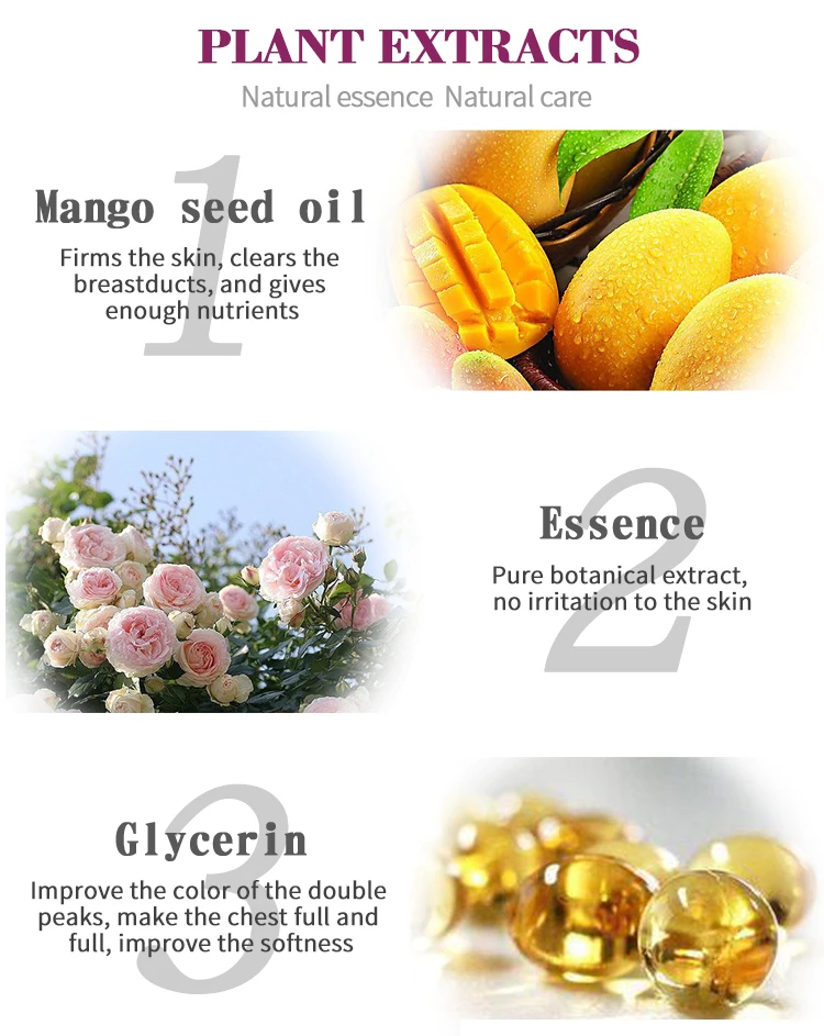 Чистые растительные экстракты не раздражают кожу. Он может затянуть кожу, очистить канал груди, дать достаточно питательных веществ, улучшить цвет двойных пиков, сделать грудь полной и полной, улучшить мягкость, восстановить прямолинейность, И создать полную и привлекательную грудь.