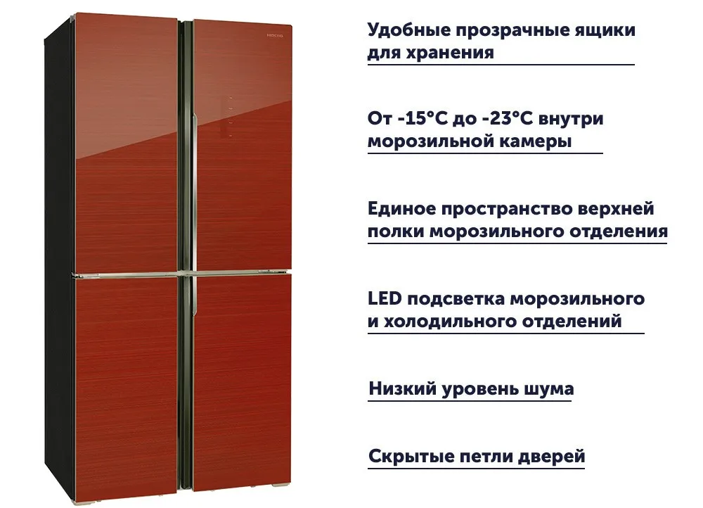 Технологичные, современные холодильники HIBERG с повышенной вместительностью избавят вас от лишних походов в магазин. Стильный дизайн холодильника позволит ему вписаться в любую обстановку и сделает Вашу кухню еще прекрасней.Холодильник очень вместителен, в нем много места для охлаждения и заморозки продуктов любой формы и размера. Он имеет четыре двери, которые широко открываются, поэтому Вы можете охватить всё содержимое одним взглядом.