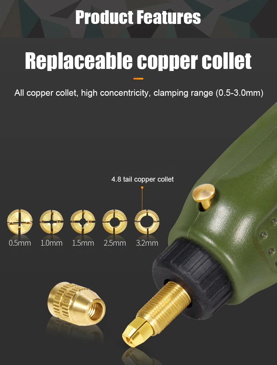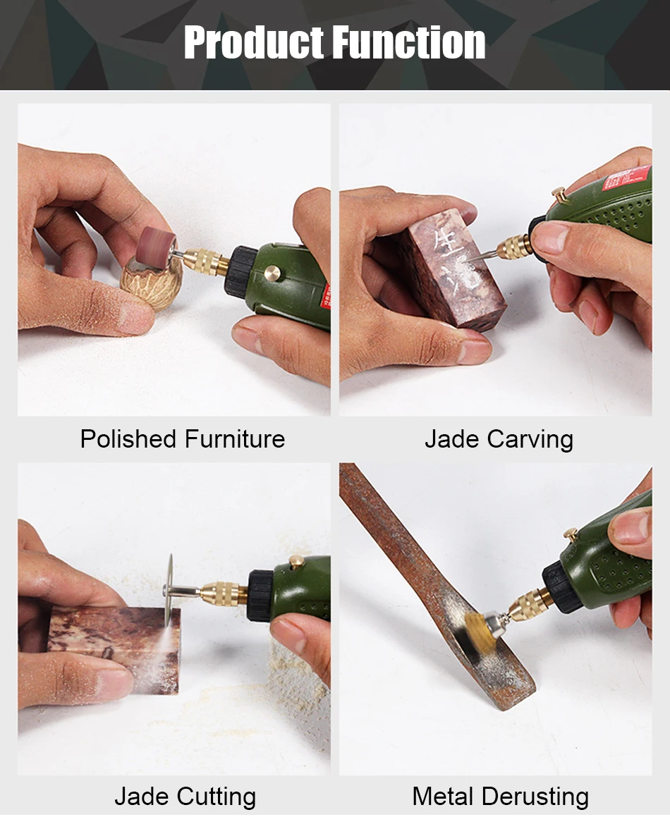 75 шт. в комплекте: 1. Проволочная щетка подходит для очистки: 3 шт. 2. Латунная проволочная щетка подходит для очистки: 3 шт. 3. Нейлоновая кисть подходит для полировки: 3 шт. 4,32 мм двойная проволочная резка подходит для резки металла: 6 шт. 5. Соединительный хвостовик диска: 2 шт. 6,22 мм каучук режущий диск для металла (черный): 6 шт. 7,22 мм каучук режущий диск для металла (красный): 6 шт. 8. Дисковая пила: 6 шт. 9. Деревообрабатывающий резец деревообрабатывающий гравировальный станок: 2 шт. 10. Большая Песочная бумага подходит для полировки: 10 шт. 11. Точное шлифование резины: 1 шт. 12. Большое шерстяное колесо полировки: 1 шт. 13. Маленькие шерстяные колеса полировки: 4 шт. 14. Небольшая ткань для полировки колес: 1 шт. 15. Полировка шерсти: 1 шт. 16. Рабочее колесо из полированной древесины: 1 шт. 17. Хвостовик для полировки шерсти: 1 шт. 18. Шлифовальная дрель для заточки камня: 1 шт. 19. Полированная секция подходит для шлифования металлов: 2 шт. 20. Шлифовальная головка для песка подходит для шлифования металлов: 4 шт. 21. Медный Зажимной патрон сверло: 4 шт. 22. Высокоскоростное стальное сверло для сверления древесины: 6 шт. 23. Гаечный ключ 1 шт.