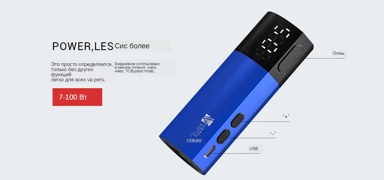 - Работает на одной батарее, подходят батареи разных типов (21700/20700/18650). - Время горения 0,002 с. - Уплотняющая прокладка для защиты электрода от утечки. - Для постоянного использования только режим Super Player, других функций нет (например, режим Tc/bypass). - Инновационный дисплей с подсветкой. - Совместима с распространенными емкостями с испарителями.