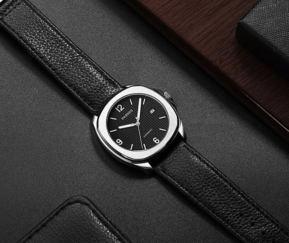 Механизм: 21 jewels miyota 821A автоматический механизм Циферблат: черный циферблат с белыми отметками, светящимися стрелками, окошком даты в 3 часа. Чехол Meterial: белый твердый чехол из нержавеющей стали 316L с PVD покрытием. Водонепроницаемость 100 м. Диаметр корпуса: 38,5 мм. Толщина корпуса: 11,5 мм. Ремешок: 22 мм ширина черный кожаный ремешок. Тип застежки: кожаное ведро Стекло: сапфировое стекло. Функция: Настройка даты
