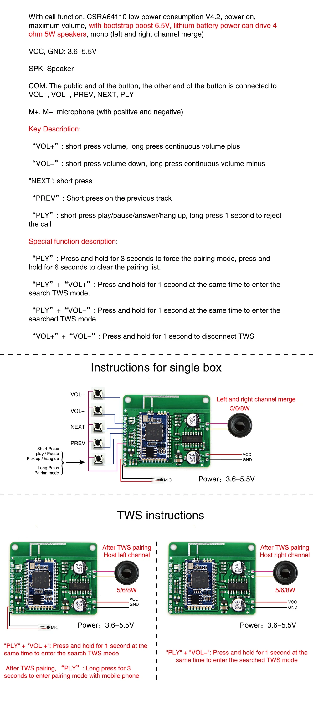 1.* CSRA64110 Bluetooth-совместимая Плата усилителя с TWS funciton