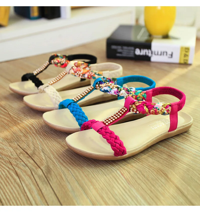 Женские сандалии в богемном стиле LAKESHI, летние пляжные вьетнамки с открытым носком и кристаллами, Модные женские сандалии на плоской подошве, 2018