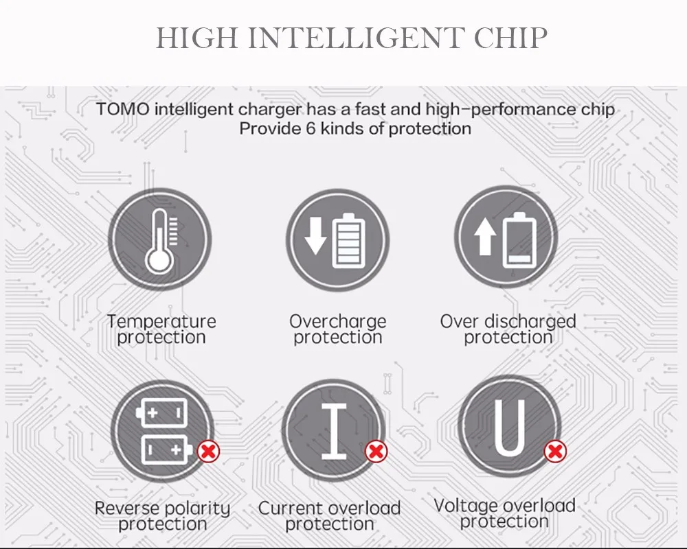 Когда дело доходит до обратной полярности, чип внутри автоматически определяет и отключает питание цепи обратной полярности, отображает пустой уровень заряда батареи