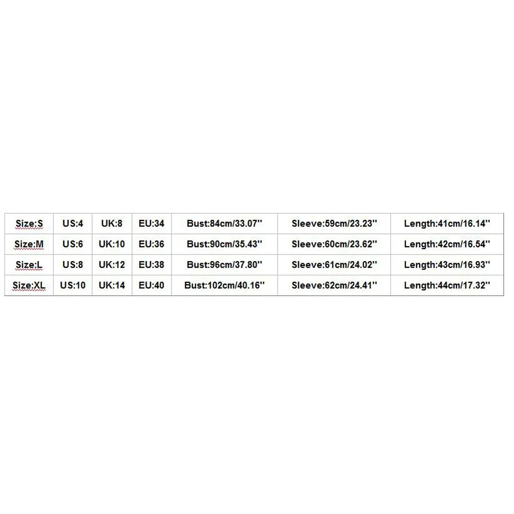 Размер: S, US:4, UK:8, EU:34, обхват груди: 84 см/33,07 дюйма, длина рукава: 59 см/23,23 дюйма, длина: 41 см/16,14 дюйма Размер: M US:6 UK:10 EU:36 Бюст: 90 см/35,43 ''рукав: 60 см/23,62'' Длина: 42 см/16,54'' Размер: L US:8 UK:12 EU:38 бюст: 96 см/37,80 ''рукав: 61 см/24,02'' Длина: 43 см/16,93'' Размер: XL US:10 UK:14 EU:40 Бюст: 102 см/40,16 ''рукав: 62 см/24,41'' Длина: 44 см/17,32''