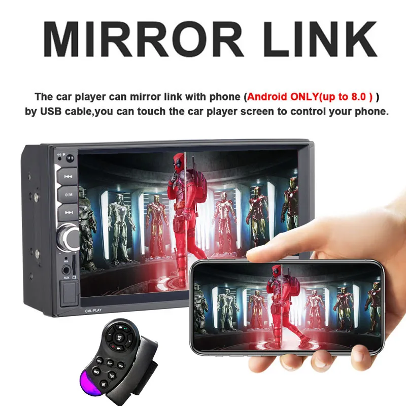 7-дюймовый сенсорный экран HD + Bluetooth + FM/MP5 + двойной usb-порт/Слот для tf-карты + вход Aux + вход камеры заднего вида + зеркальная ссылка. Этот с самым современным технологическим зеркалом. Вы можете связать свой телефон (только Android (до 8,0) с воспроизведением через usb-кабель. Затем вы можете прикоснуться к плееру, чтобы контролировать свой телефон! Встроенный двойной usb-порт, можно подключить к камере DVR через задний usb-порт.