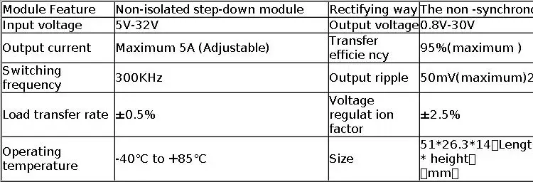 Свойства модуля: неизолированный модуль постоянного тока и напряжения Исправление: несинхронное исправление: Входное напряжение: 5 В-32 в Выход напряжение: 0,8 V-30V Выходной ток: регулируемый максимальный 5A Эффективность преобразования: 95% (самый высокий) Частота переключения: 300 кГц Выходная пульсация: 50 мВ (макс.) 20 м полоса пропускания Регулирование нагрузки: ± 0.5% Регулирование напряжения: ± 2.5% Рабочая температура: от-40 до + 85 градусов по Цельсию Размер: 51*26,3*14 (Д * Ш * В) (мм) Выходная мощность: 30 Вт