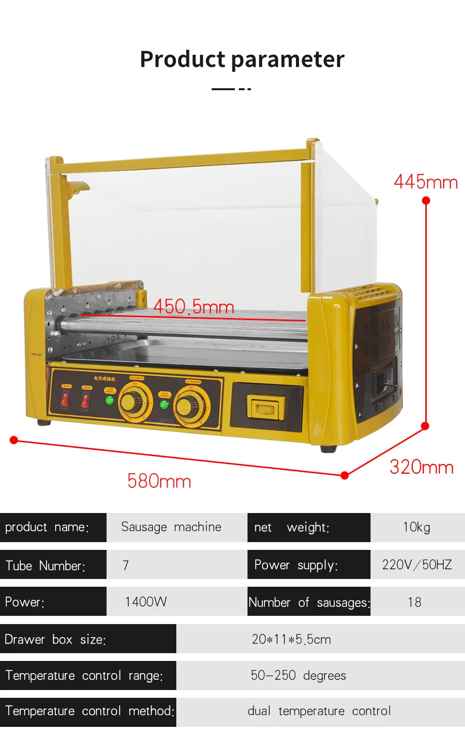 Модель: TT-D7 Машина для хот-догов: 7 трубок Напряжение: 220 В Мощность: 1,4 кВт Размер: 580*320*445, Вес нетто: около 10 кг Материал корпуса: инженерный пластик