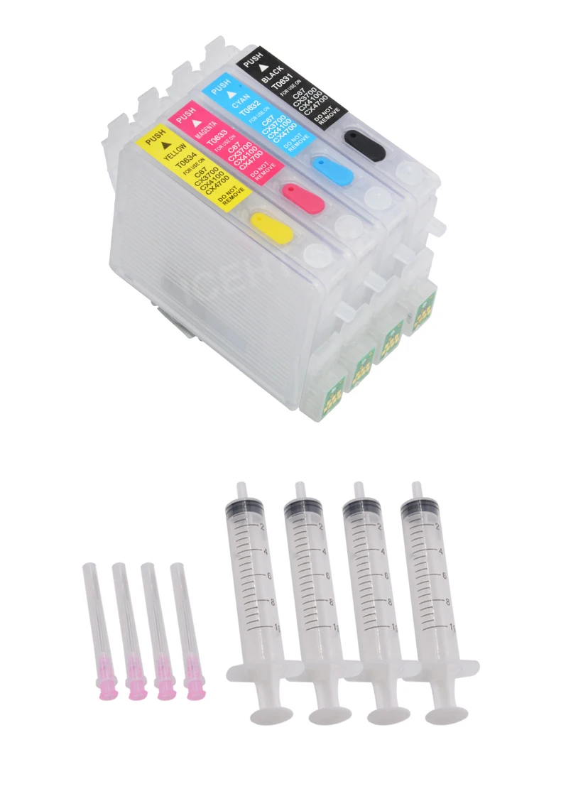Упаковка: картридж с чернилами T0631-4 4 цвета + чернила для 4 бутылок + 4 шприца и иглы
