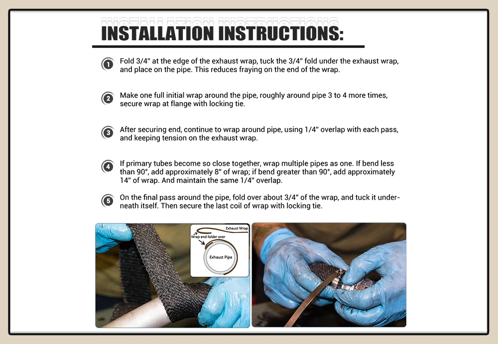 1. Fold 3/4” at the edge of the exhaust wrap, tuck the 3/4” fold under the exhaust wrap, and place on the pipe. This reduces fraying on the end of the wrap.2. Make one full initial wrap around the pipe, roughly around pipe 3 to 4 more times, secure wrap at flange with locking tie.3. After securing end, continue to wrap around pipe, using 1/4” overlap with each pass, and keeping tension on the exhaust wrap.4. If primary tubes become so close together, wrap multiple pipes as one. If bend less than 90°, add approximately 8” of wrap; if bend greater than 90°, add approximately 14” of wrap. And maintain the same 1/4” overlap. 5. On the final pass around the pipe, fold over about 3/4” of the wrap, and tuck it underneath itself. Then secure the last coil of wrap with locking tie.Note: