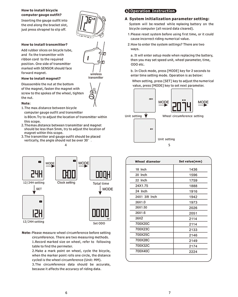1. Как установить параметры колеса? Когда секундомер отображает скорость езды и текущее время, нажмите и удерживайте кнопку mode слева в течение 2 секунд, чтобы войти на страницу для настройки параметров велосипедного колеса. 2. Он может быть использован на 29-дюймовый велосипеда? Он может использоваться на 29-дюймовый велосипеда, вы можете установить колеса параметры согласно колеса параметр схеме. 3. Когда старая батарея используется, потеряны ли данные общего пробега при замене новой батареи? (1). Все данные на компьютере удаляются после замены аккумулятора. (2).ODO может быть изменен, запись ODO числовое значение перед заменой батареи. (3). Пожалуйста, используйте батарею CR2032, анод батареи (+) Сторона находится в направлении крышки батареи.