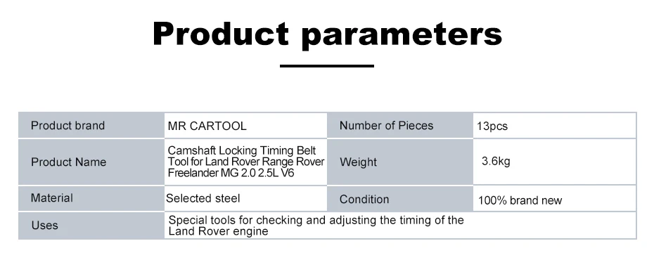 Включая инструмент блокировки шкива распредвала, инструмент звездочки, направляющие штифты, инструмент коленчатого вала, набор поставляется со всеми инструментами, которые вам нужны для работы.