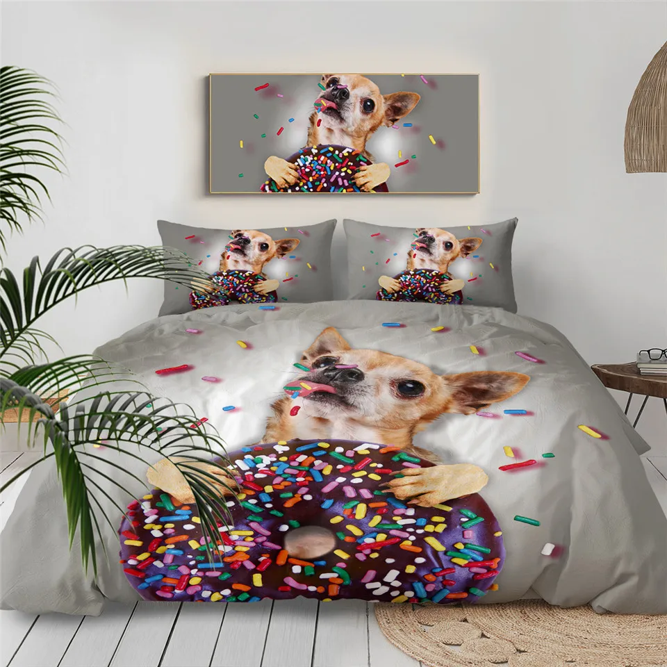 Название товара:Комплект постельного бельяУпаковочный лист:1 * пододеяльник + 2 * наволочкиТкань:ПолиэстерСезон:Весна, лето, осень, зимаОсобенности:Щенок держит в руках огромный пончик, конфеты-его любимая. Какой прекрасный дизайн!