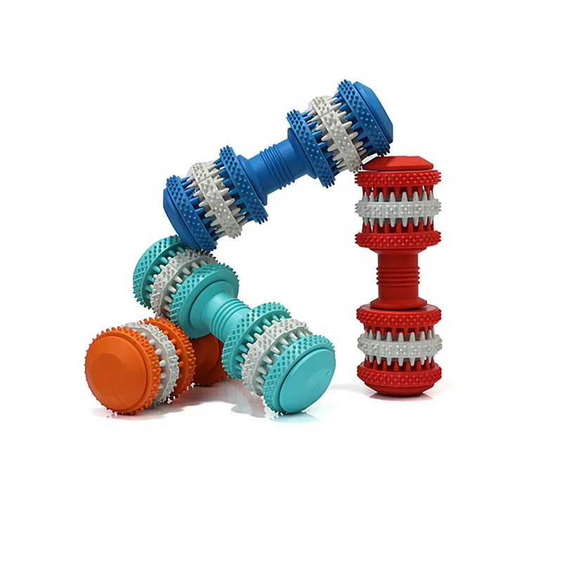 Форма гантелей облегчает взаимодействие и игру между владельцем и собакой. В Кроме того, укусывание молярного стержня может удалить вычисление с зубов и предотвратить пародонтит. Кроме того, сила укуса рта может быть обучена кусанию кости.