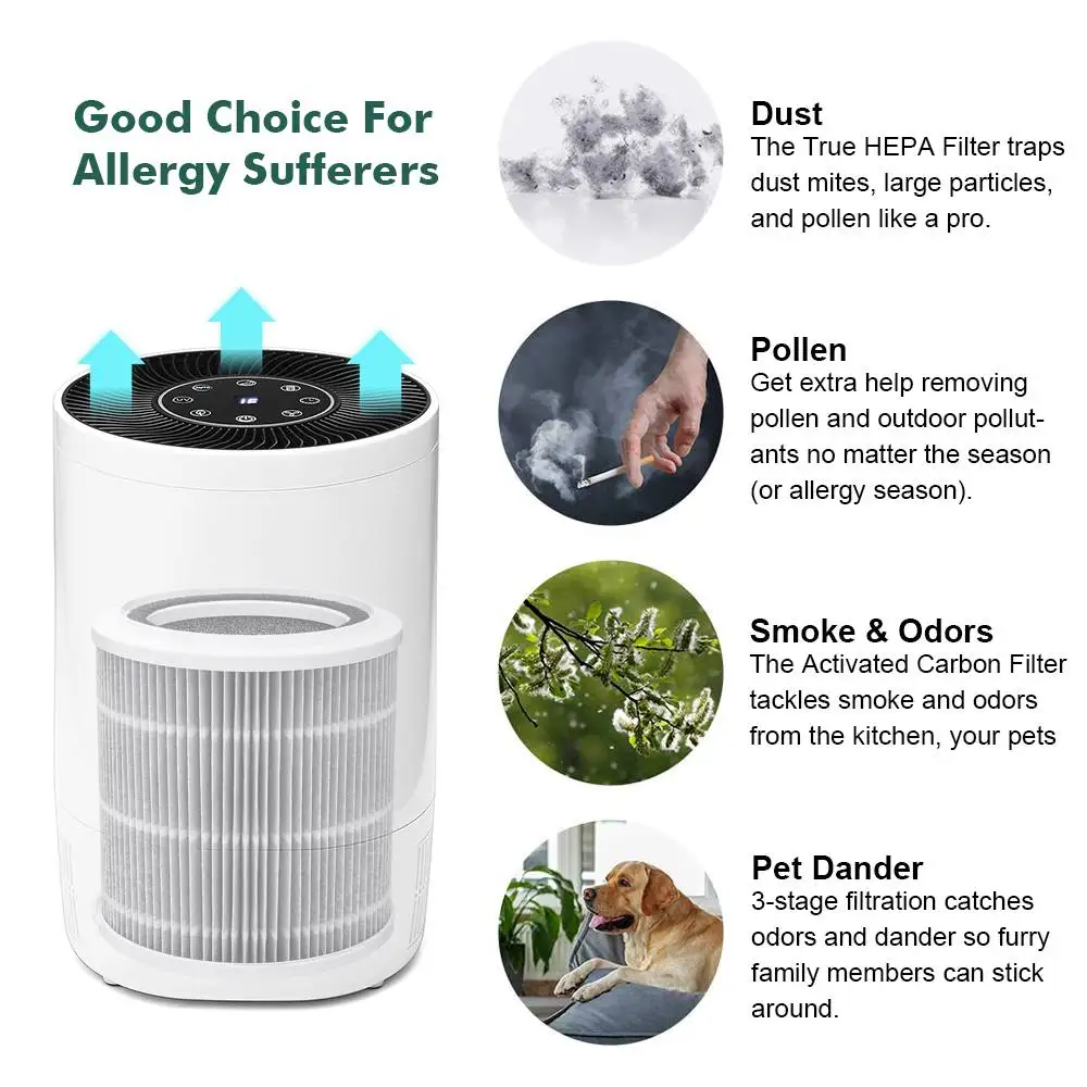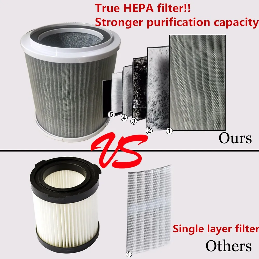 * 5 мощных фильтров *:Включая первичную грубую очистку, очистку ЭВА, фильтр HEPA, очистку активированного угля кокосовой скорлупы, очистку HEPA, удаление 99.99% PM2.5, формальдегида, бактерий, пыльцы, дыма, плесени, пыли, запахи и ПЭТ dander,TVOC и другие вещества. Очищает воздух и улучшает здоровье. Идеально подходит для людей, страдающих аллергией, носовой духотой, кашлем, чиханием, астмой и т. д.