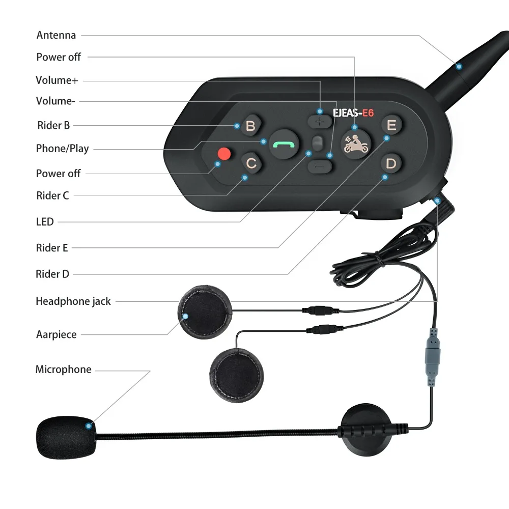 Между двумя гонщиками среди шести гонщиковМаксимальный диапазон разговоров: 1200 м/3937 футов между 2 гонщикамиМаксимальная рабочая скорость: до 120 км/чАккумулятор: 530 мАчВремя работы в режиме разговора: До 8 часовВремя работы в режиме ожидания: 100 часовЧастота: 2,4 ГГцЯдро Bluetooth: Bluetooth 3,0Аккумулятор: литий-полимерный аккумулятор 550 мАчВремя зарядки: около 3 часовБренд чипа: CSRИсточник питания: AC 110V ~ 240VВыходная мощность: 5 В постоянного тока 55 ~ 75 мАПосылка включает 1 шт. E6: