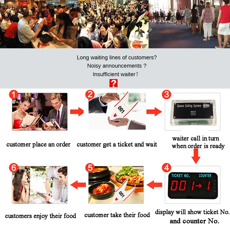 * Система вызова номера очереди может использоваться в ресторан, цепочке быстрого питания, сервисном центре, супермаркете. * Клиент вносит заказ на доставку; * Счетчик Принимает заказы, затем выдает клиенту номер Q из диспенсера билета. * Клиент ждёт где-то заказа. * Когда заказ готов. Например, заказ № 99 готов. Кухня можете нажать 99 + "ENT" ключ от клавиатуры передатчика. * Затем номер 099 будет отображаться на экране приемника со звуком dingdong. * Клиент или официант будут видеть номер дисплея и отправляться за едой. * Передатчик клавиатуры помещается на прилавке. Приемник дисплея установлен на стене, чтобы клиент мог его увидеть.
