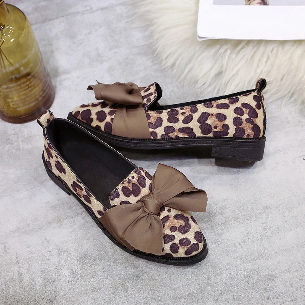 Женские слипоны из флока с острым носком и леопардовым принтом, легкие туфли с бантом