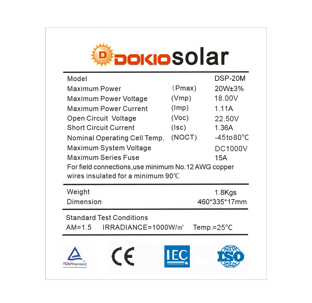 Солнечная панель DOKIO, 18 в, 12 В, 20 Вт, малая, китайские водонепроницаемые панели, комплекты солнечных батарей, ячейка/модуль/система